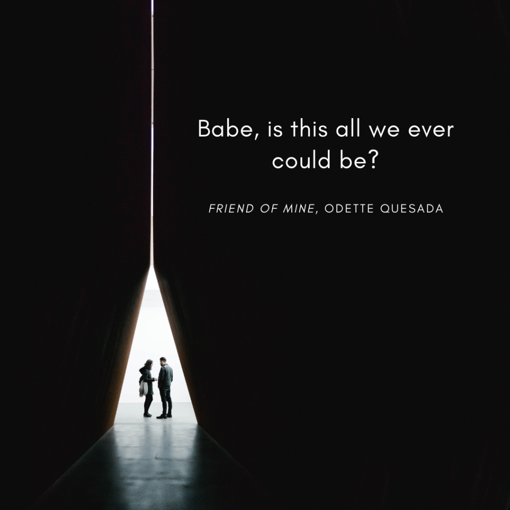 Odette Quesada’s “Friend of Mine” is a classic song about unrequited love. The line “is this all we ever could be” is terse and powerful and it makes me feel sad — but then again, I’m glad. Wuw, hahaha.