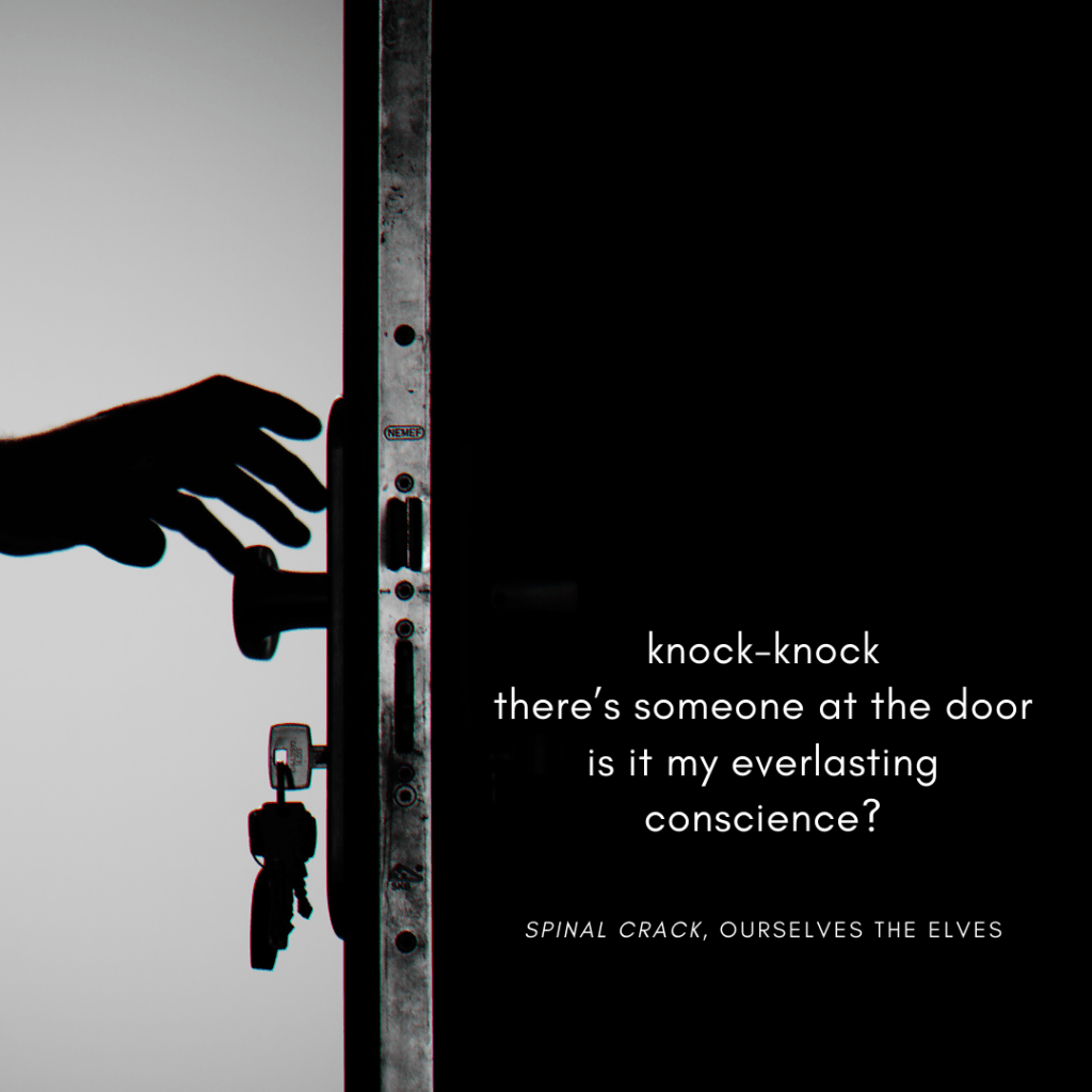 This “knock-knock” line from “Spinal Crack” by Ourselves the Elves makes more sense if you listen to the entire song. The song sounds upbeat and quirky even if it actually speaks of violent themes. (Think I’m Thinking of Ending Things, huhu.)