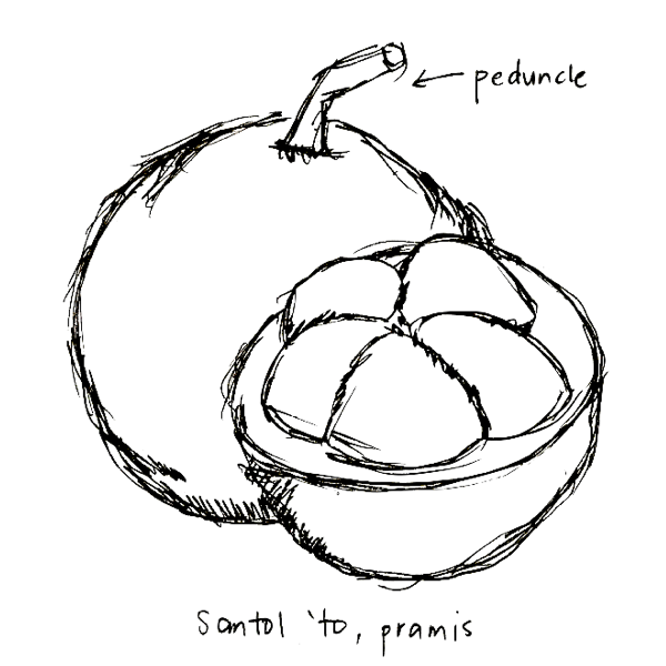 Pagkatapos ng misa at pagkauwi sa bahay, nagbuklat agad ako ng encyclopedia at hinanap ang litrato ng anatomiya ng prutas. Ang pinaka-posibleng titi ng santol, batay sa aking research, ay ang peduncle. Ito ang maikling sanga na nakausli sa bumbunan ng bunga ng santol.