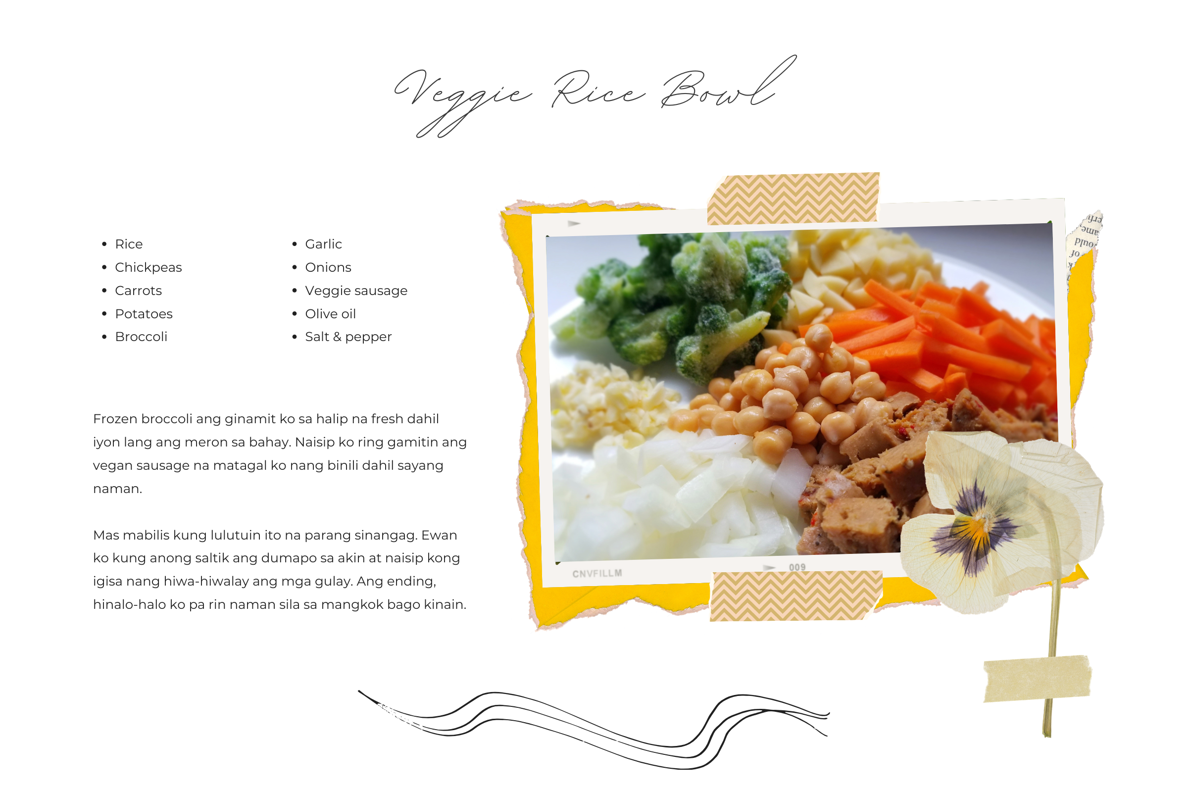Initially I just wanted to have regular fried rice for lunch but I ended up making a veggie rice bowl instead. It’s really just regular sinangag, except it takes more effort to make and the presentation looks more boujee. Ingredients-wise, it’s just the same as veggie fried rice.