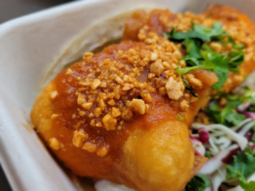 We also ordered what L called “donuts,” but they looked nothing like donuts. They had the same chewy wrapper as the rice noodle rolls, but inside was a crunchy treat that had the same texture as a croissant, just a little tougher. You’re supposed to dip it in a peanut butter and hoisin sauce mix. L loved it. I thought it was alright.