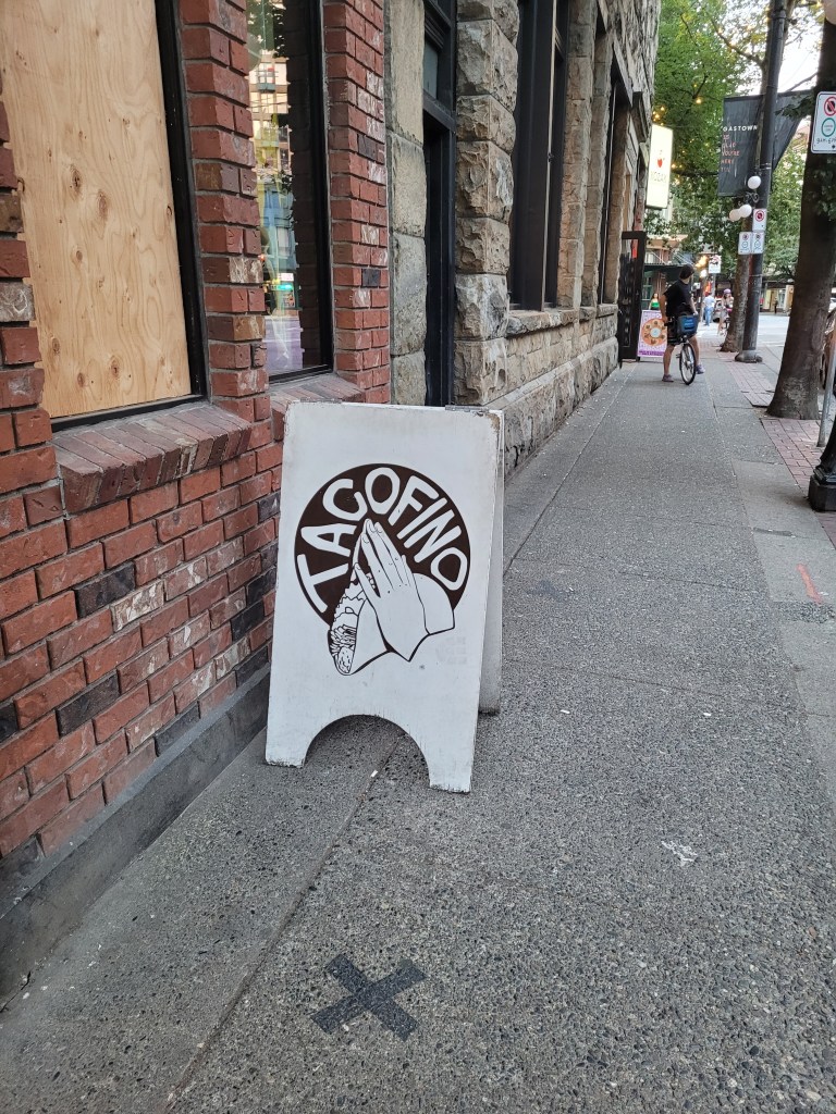 And now come the tacos! We went to the taco bar in Gastown because it was on L’s checklist. Tacofino has a sit-down restaurant, but it also has a takeout stall by the entrance. We decided to order takeout and eat on the patio instead of waiting for a table.